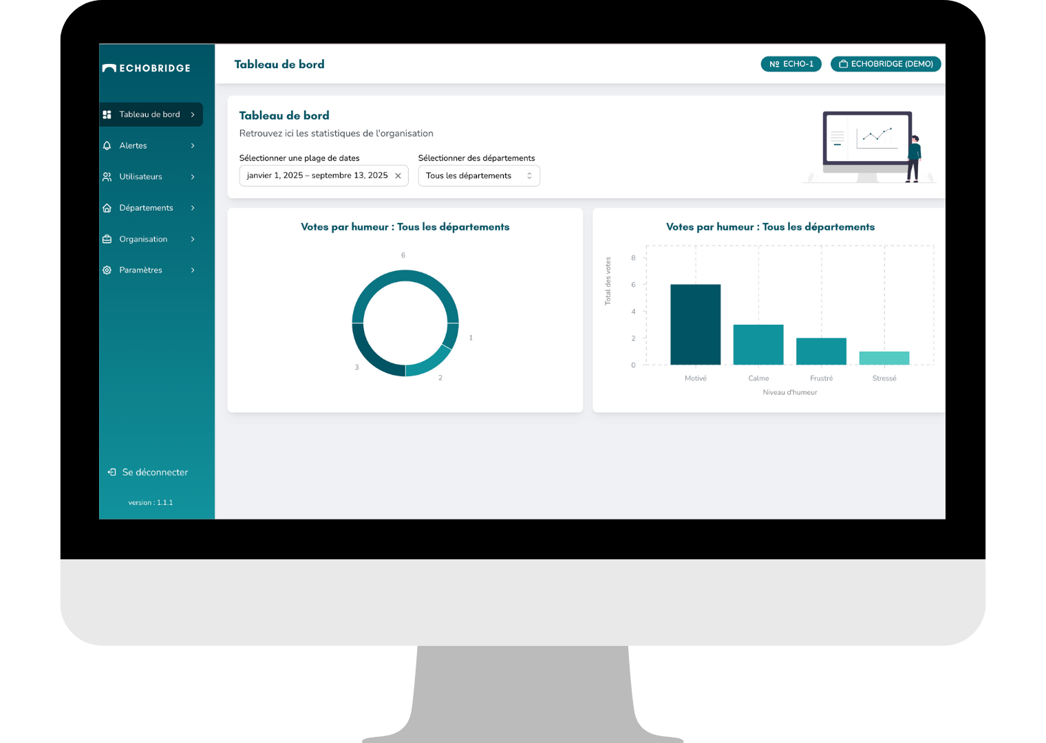 Une plateforme complète pour les équipes dirigeantes, offrant une vision globale et des outils personnalisés pour suivre, analyser et améliorer le bien-être au travail. L’interface permet une gestion simplifiée et des données accessibles en temps réel.